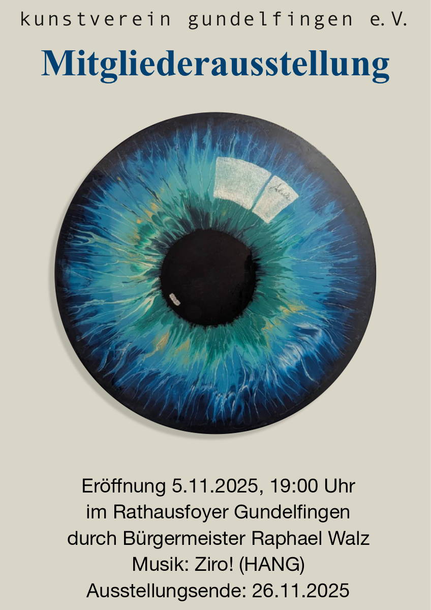 Bei der jeweils gegen Ende eines Jahres stattfindenden Jahres-Ausstellung des Kunstvereins Gundelfingen zeigen die etwa 20 bis 25 auf dem Gebiet der Malerei und der plastischen Künste aktiven Vereinsmitglieder ihre Werke. Diese Ausstellung steht absichtlich allen Mitgliedern offen, professionellen Künstlern genau so wie Autodidakten und gelegentlich Kunstschaffenden. Da diese Ausstellung nicht juriert ist, können hier neue Ideen und Ausdrucksmittel ein Forum finden. – Eröffnung: 8.11. um 19 Uhr.